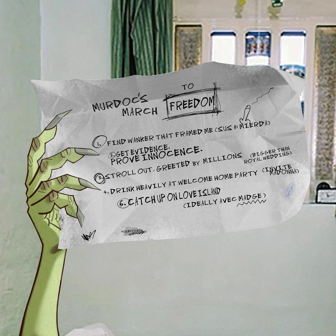 Далее Мёрдок решил выбраться из тюрьмы досрочно, используя канализацию. Он заполучил её план, наврав обслуживающей компании о том, что от него уползла домашняя игуана. Однако телефон, полученный у охранника тюрьмы, который ему каким-то образом задолжал, не мог открыть файл, и Никкалсу снова потребовалась помощь. С помощью фанатов он добрался до ворот и открыл их, и вскоре уровень отходов начал подниматься. Связь с басистом прервалась, когда он упёрся в канализационный тупик и якобы захлебнулся.