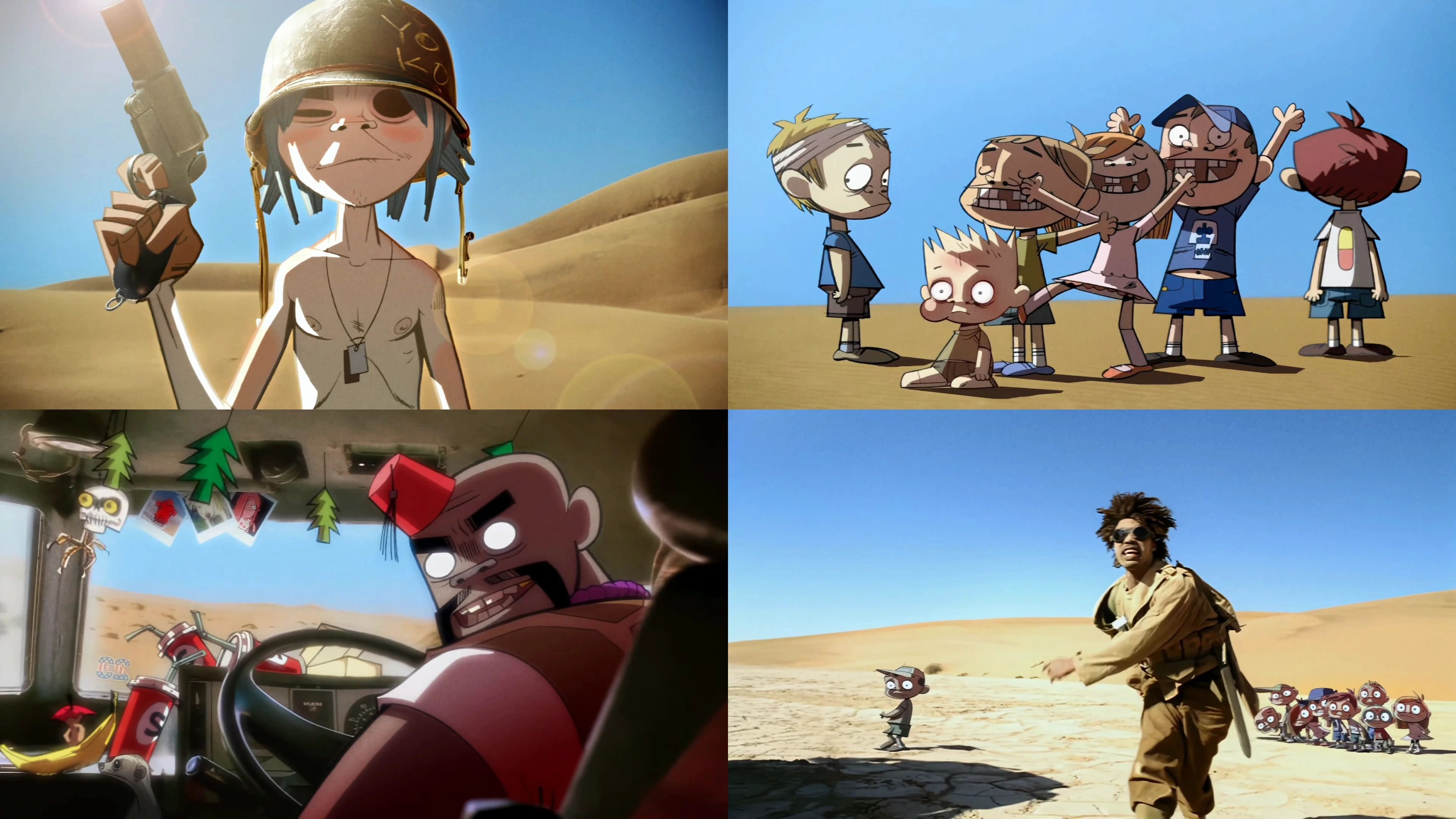 A helicopter has crashed in a desert, and 2-D, along with a bunch of small children, that have survived the crash. He fires off a flare, hoping to attract the attention of rescuers. The other 3 members of Gorillaz (who are in the Casspir), some ways away, see the flare, and head for where it came from. While waiting for them to get there, 2-D starts playing "Dirty Harry" on his fold-out keyboard and the kids sing along. When the APC arrives at 2-D and the children's location, Bootie Brown rises out of the sand and starts rapping. When the song finishes they all get in the APC and it drives off, only to break down short of 20 feet away.