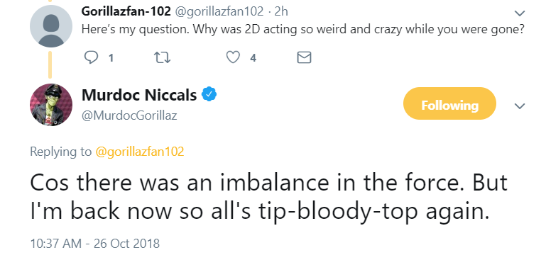- When He was asked on Twitter by a user named Gorillazfan-102, on why 2-D had behaved unusually during his absence Murdoc responded by saying "Cos there was an imbalance in the force. But I'm back now so all's tip-bloody-top again."