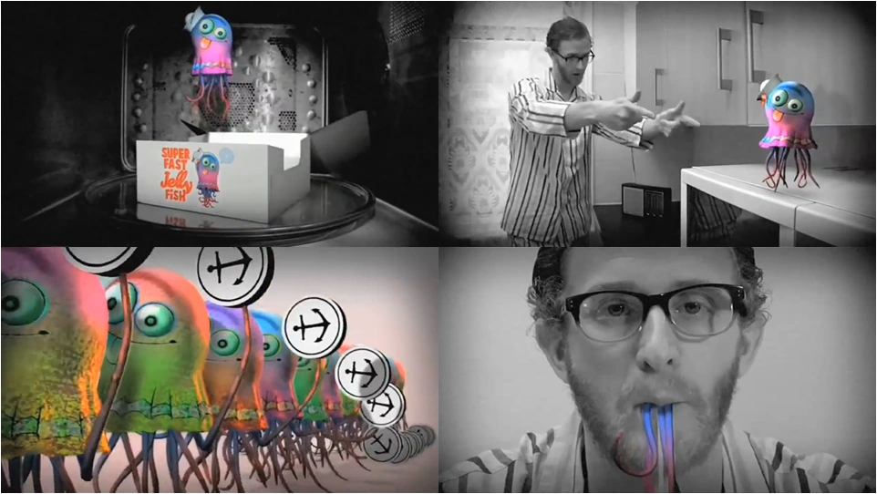 The music video opens with a black and white scene depicting a disheveled man crawling out of bed. The man then realized that it was time for breakfast and pulls out a box of Superfast Jellyfish before stuffing it into the microwave. After several seconds of waiting, a technicolor animated jellyfish pops out of the box to greet the man who was anxiously waiting for breakfast. The jellyfish then floats out of the microwave and engages in an elaborate psychedelic dance sequence with the man; accompanied by an entire school of jellyfish. The video ends with a black and white closeup on the man devouring the colorful jellyfish and slurping it's tentacles into his mouth.