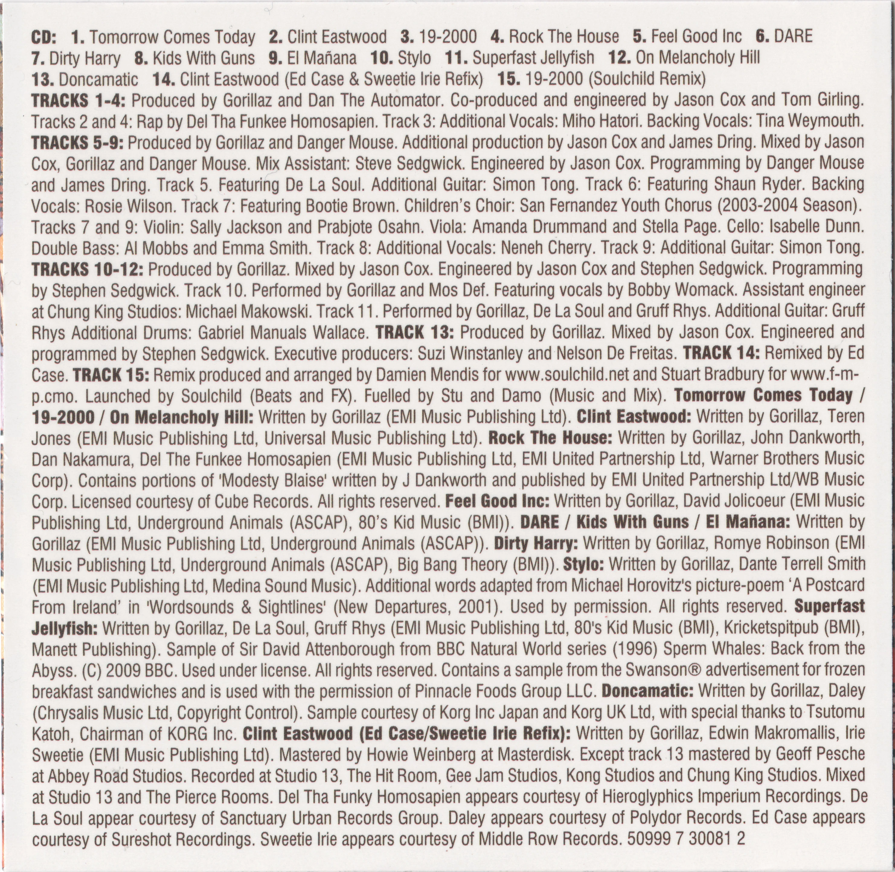 - ↑ Gorillaz, "The Singles Collection 2001-2011 [Japanese standard edition]", WPCR-50332, Booklet p. 10-13